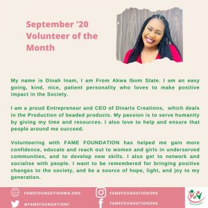 Our volunteer of this month is Dinah Inam, who began volunteering at FAME in 2017 and since then has given her time and resources for the betterment of women and girls in the communities we reach out to. She hails from Akwa Ibom and has an easy-going, kind and patient personality.