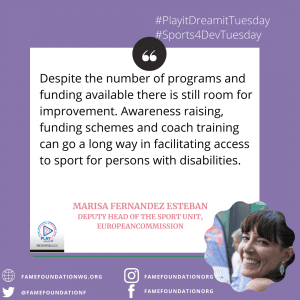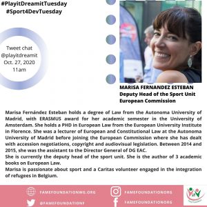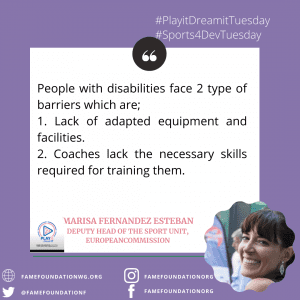 On this edition of PlayitDreamitTuesday, 27 October, 2020. We have with us Ms. Marisa Fernandez Esteban, Deputy Head of the Sport unit, Directorate-General for Education, Culture, Youth and Sport, at European Commission and she will be discussing, “how sport can be used to empower disabled women and how to improve disabled sports”.