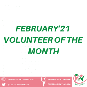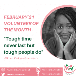 “Volunteering with FAME Foundation has being an awesome experience for me. I love the fact that I’m giving back to my community” said Ms. Miriam Kinkyes Gumwesh, our volunteer of the month.