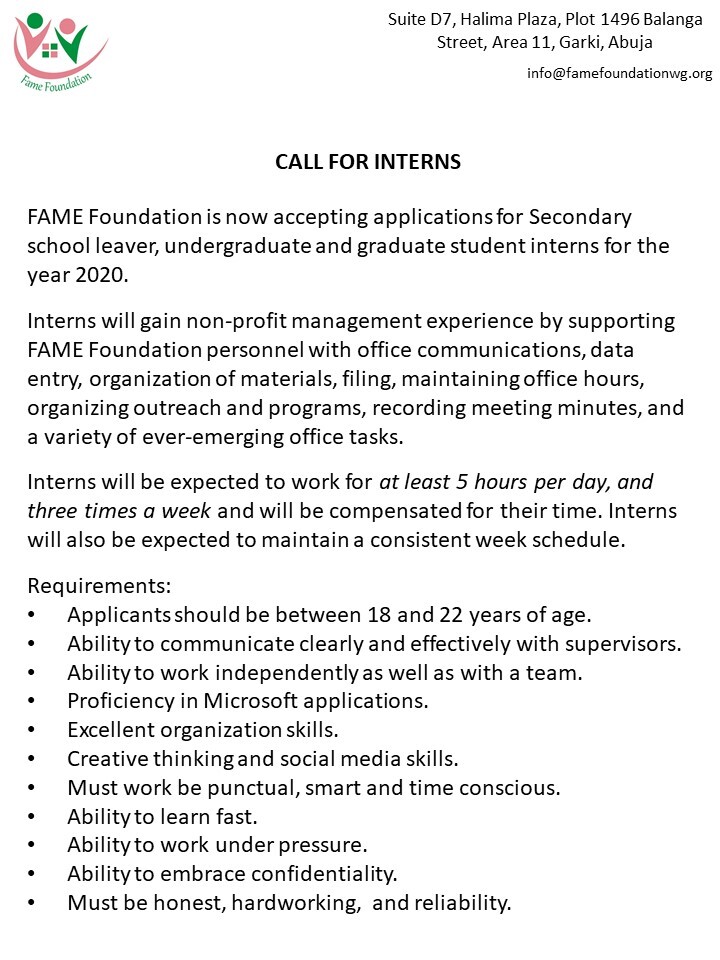 FAME Foundation is now accepting applications for Secondary school leaver, undergraduate and graduate student interns for the year 2020. Interns will gain non-profit management experience by supporting FAME Foundation personnel […]